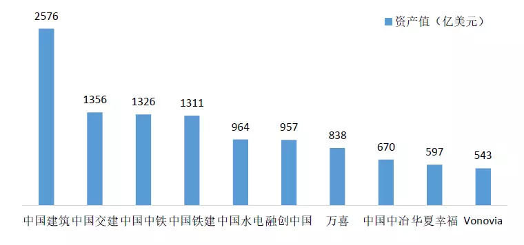 4、資產值最高的建筑公司是?從資產值來看,仍然是中國一家獨大,建筑公司資產值10強中來自中國的公司有8家,另外兩家為萬喜和Vonovia,其中Vonovia取代布依格第1次進入該榜單。資產值排在前4名的依然是中建、中交、中國中鐵和中國鐵建。作為產業(yè)新城運營商的華夏幸福第一次擠入了該榜單。