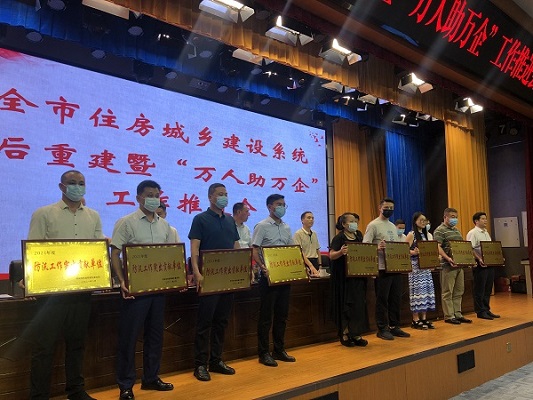 9月3日下午,全市住房城鄉(xiāng)建設(shè)系統(tǒng)災(zāi)后重建暨“萬人助萬企”工作推進會召開。會議總結(jié)了七、八月份住房城鄉(xiāng)建設(shè)系統(tǒng)防汛工作,表彰了在防汛及災(zāi)后重建工作中表現(xiàn)優(yōu)異的突出貢獻企業(yè)和先進個人,并頒發(fā)了獎牌和獎狀;重點部署和安排了災(zāi)后重建、“萬人助萬企”活動。我公司獲評防汛工作突出貢獻先進單位,張永輝同志獲評全市住建系統(tǒng)防汛工作先進個人。